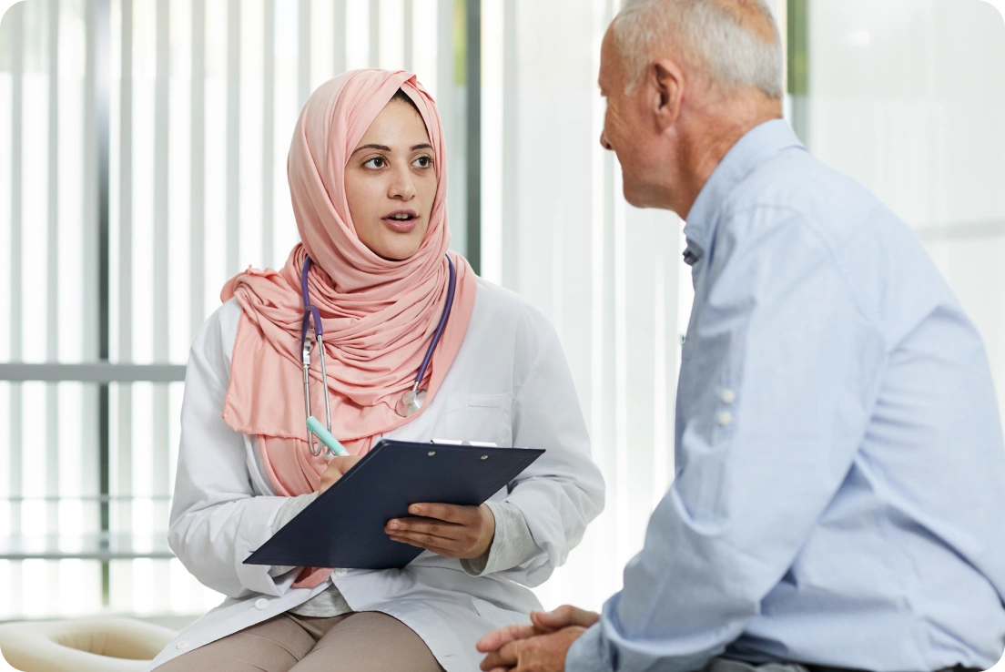 تقييم شامل للحالة الصحية، والاستماع الدقيق لشكوى المريض، مع شرح واضح لخطة التشخيص والعلاج.